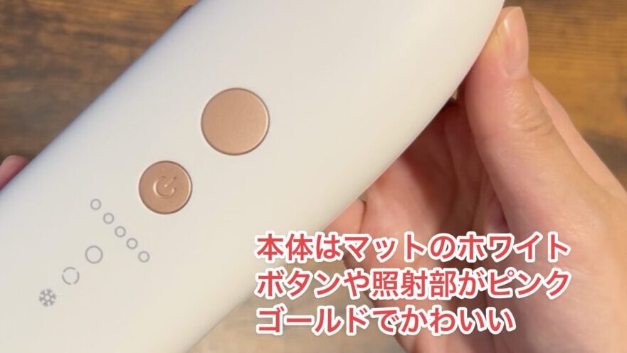 本体はマットのホワイトで、照射部やボタンにアクセントとしてピングゴールドが使われています。